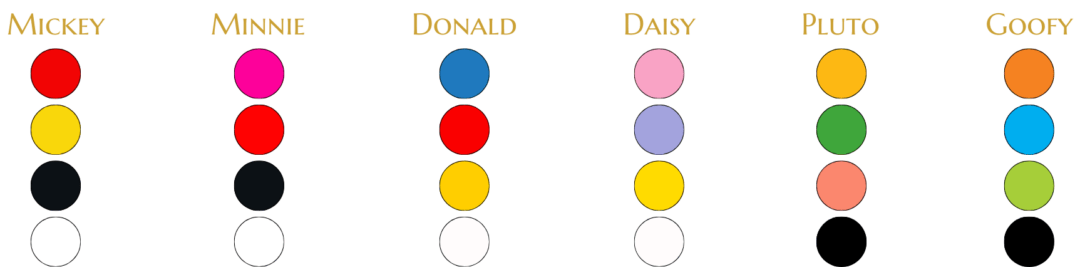 Colors: The Sensational Six -- Mickey, Minnie, Donald, Daisy, Pluto, and Goofy -- are instantly recognizable just from their distinct palettes. You can use these colors to help guide your thinking: