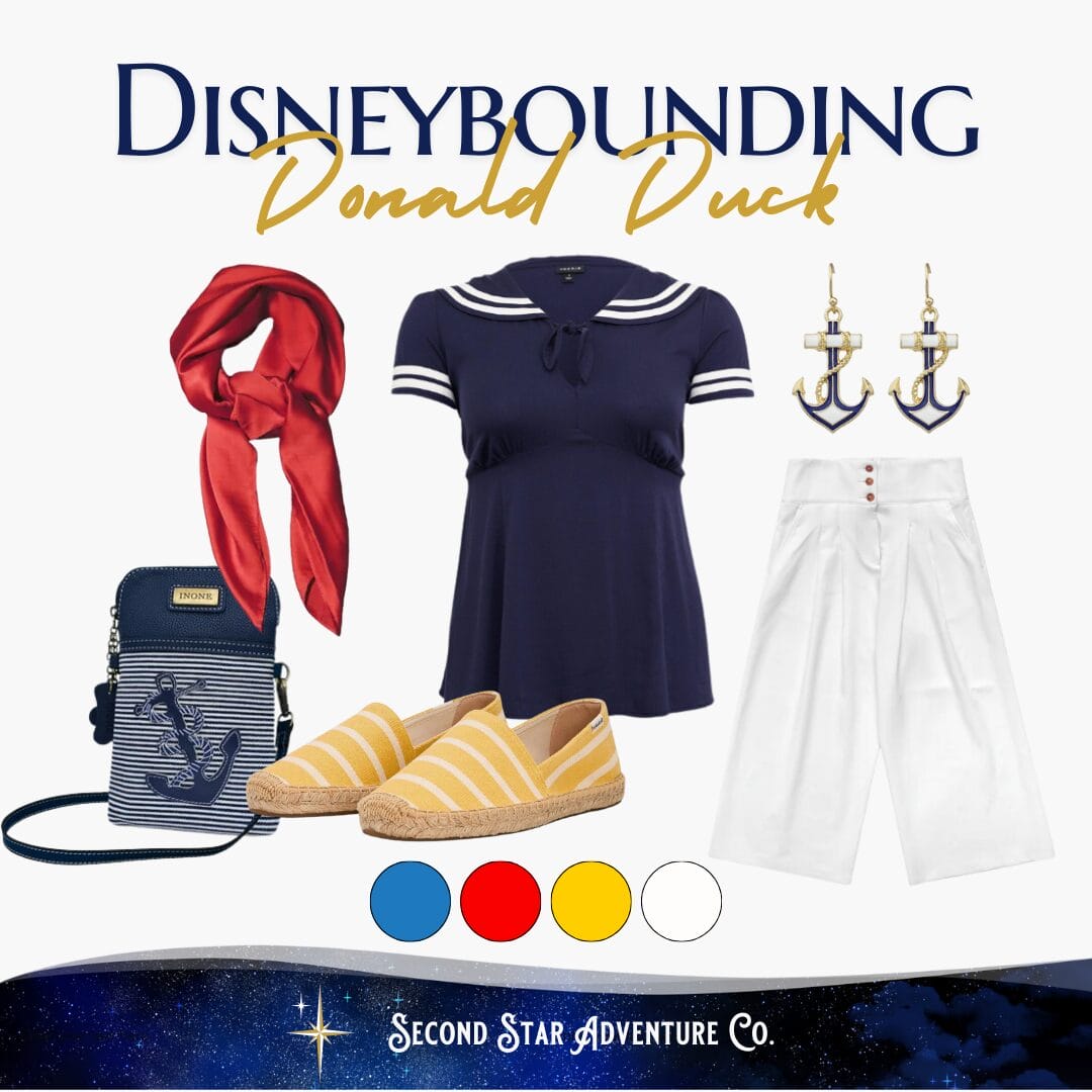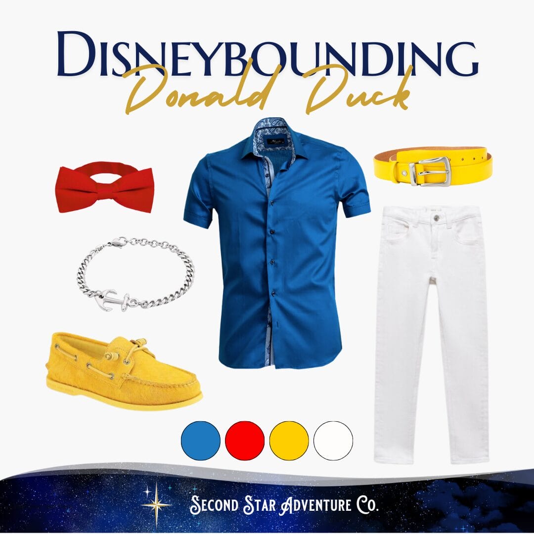 Adding some nautical touches in your accessories are a great way to bring Donald Duck to life! Boat shoes or anchor jewelry are solid choices, and a red bow tie or neckerchief are a smart accent.