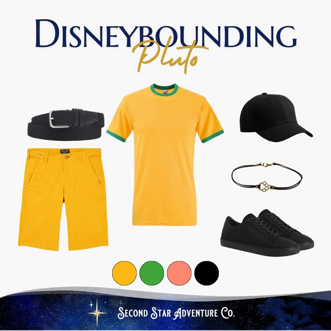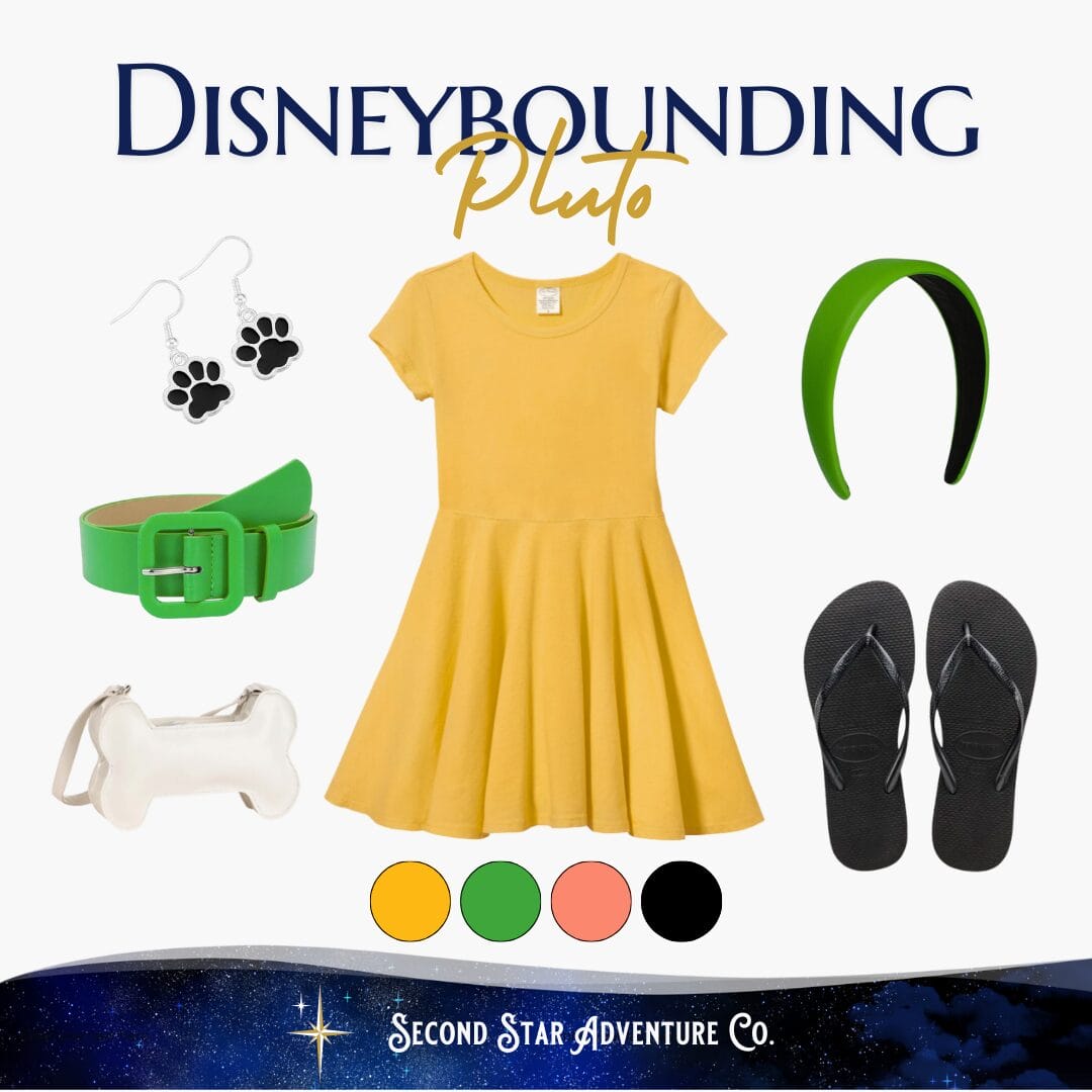 You definitely don't need a dog collar for Pluto, but pops of that green are a smart way to reference it! Belts, bow ties, hair bands, or shirt collars are fun ways to bring it in. Dog-related accessories shaped like paws or dog bones add even more fun!